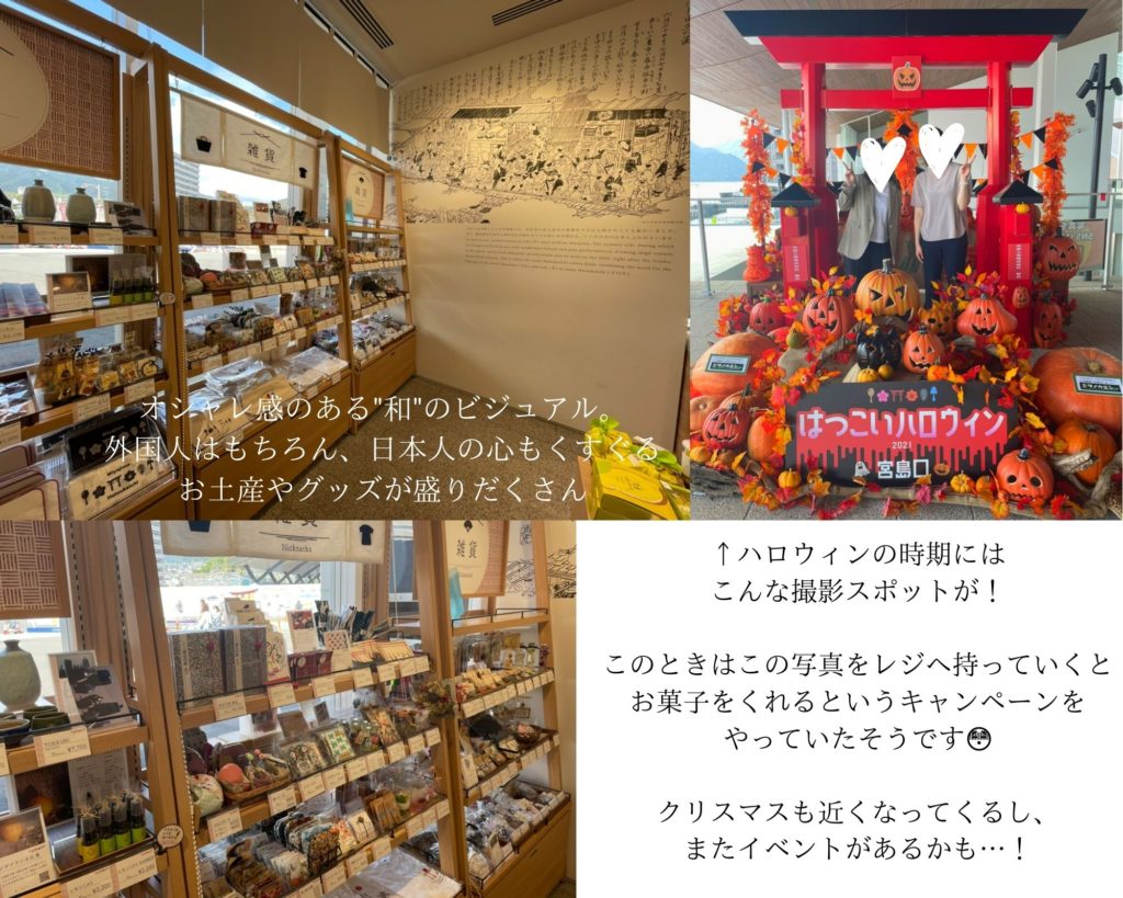 ショップは宮島ならではのお土産から自分も欲しくなる生活用品のグッズまで盛りだくさん。可愛いもの好きなお相手なら喜ぶこと間違いなし!