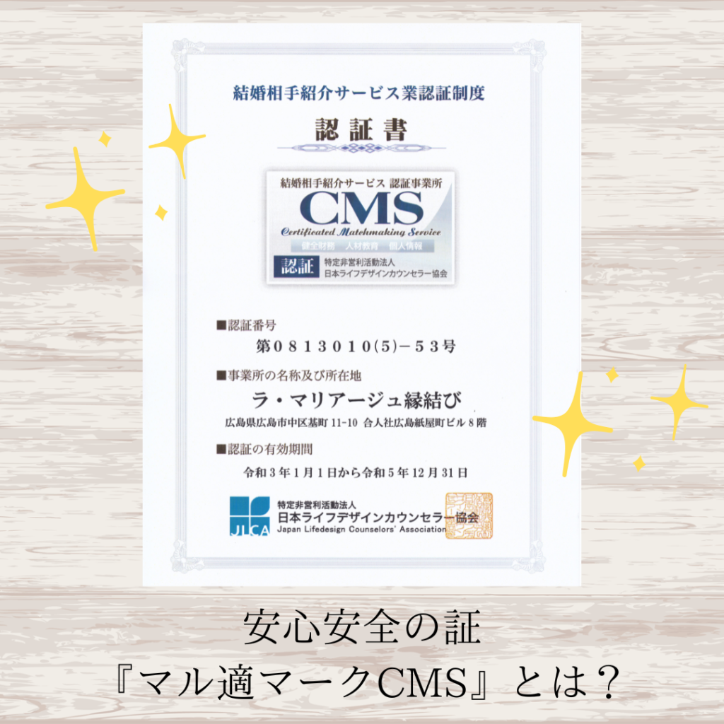ラ・マリアージュ縁結びが取得している安心安全な結婚相談所の証『マル適マークCMS』。