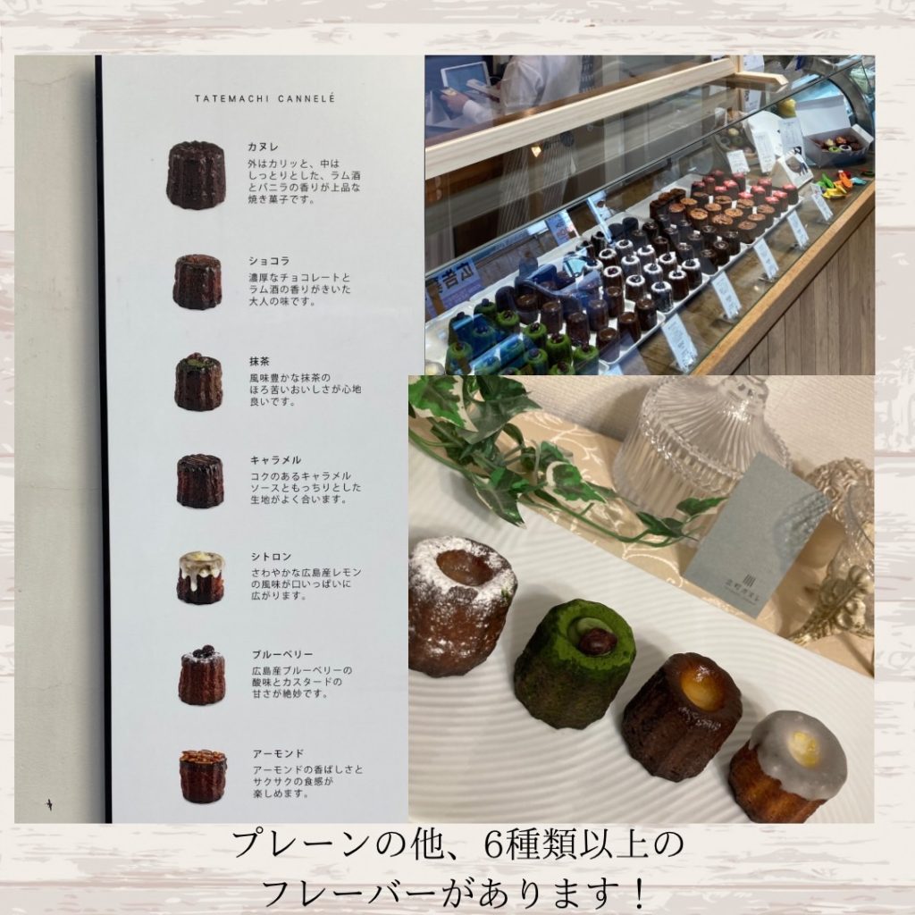 広島は一号店ですが、広島市内に2店舗の立町カヌレがあり、さらに、東京、大阪、岡山と…