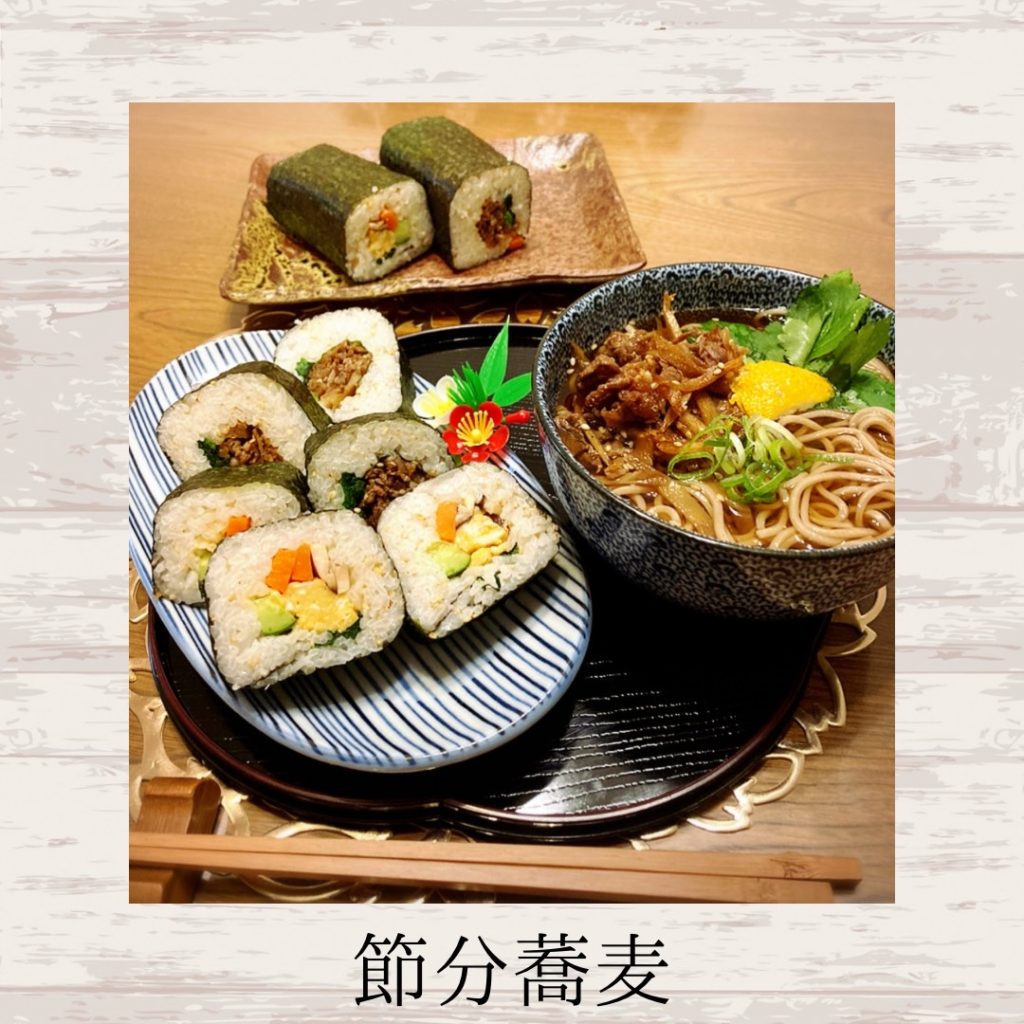 【恵方巻き、節分蕎麦、鰯、こんにゃく、けんちん汁、福豆、落花生】