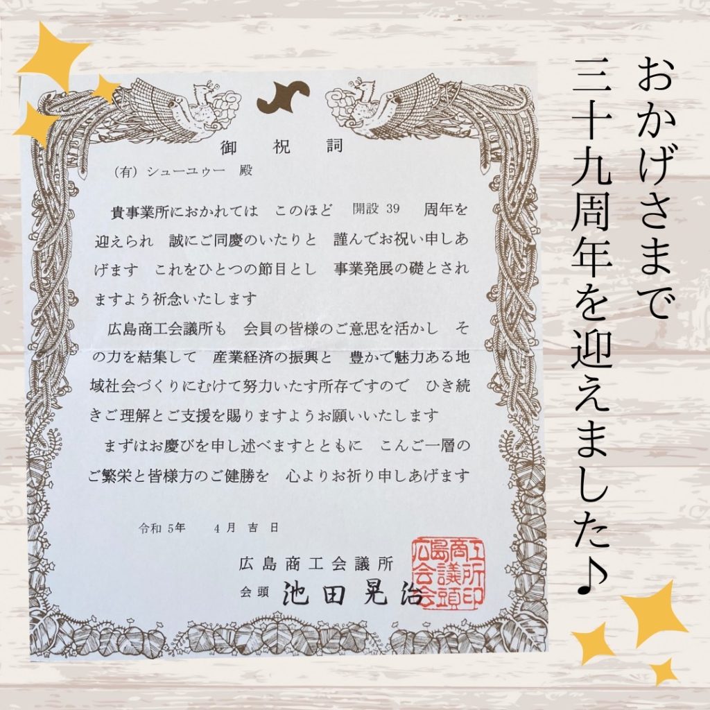 弊社は、この度、皆様のご愛顧により、今年で39周年を迎えることができました✨